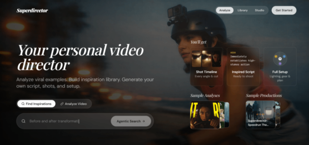 Your personal video director Analyze viral examples. Build inspiration library. Generate your own script, shots, and setup.