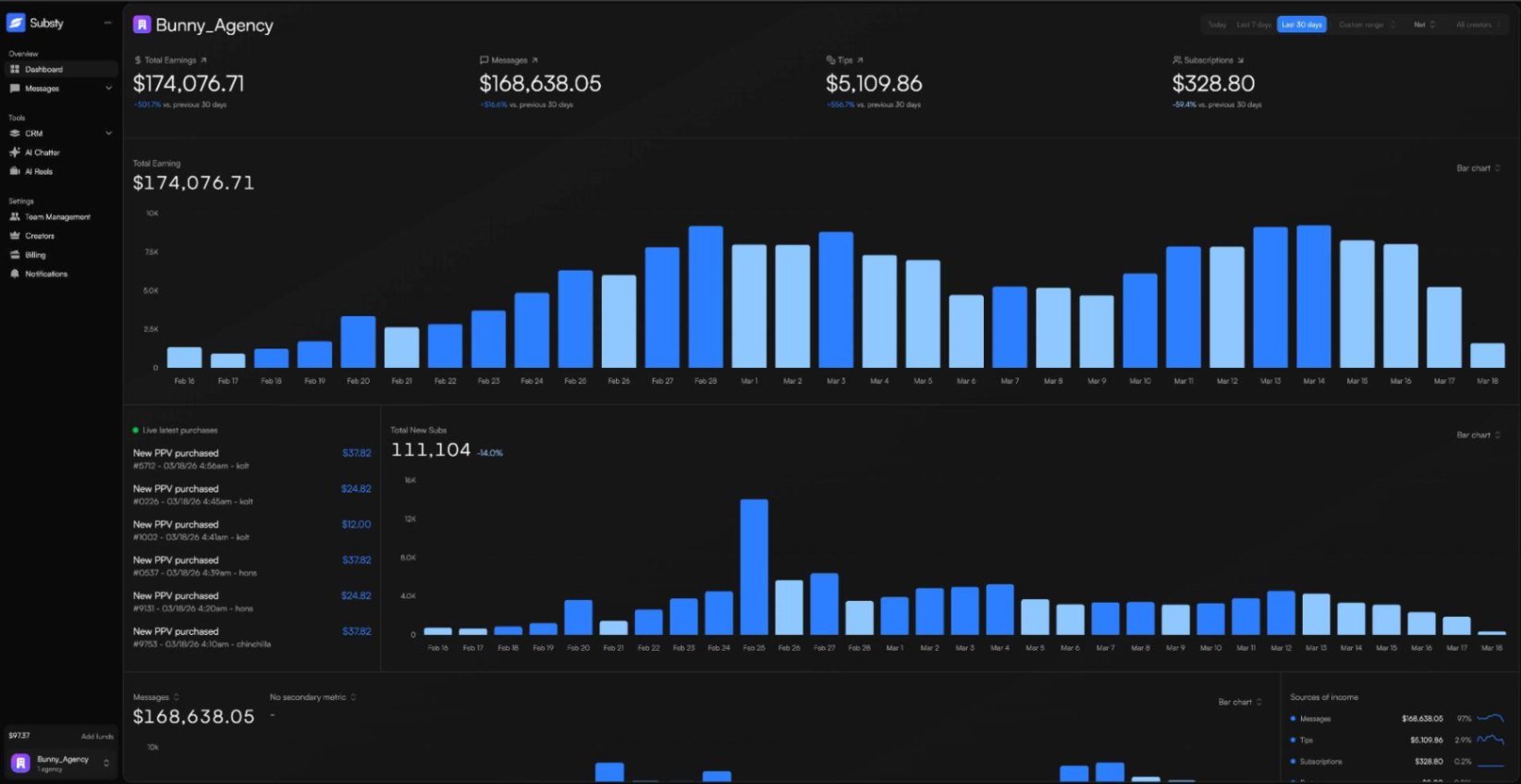 The first and most adopted CRM + AI chatbot for OnlyFans & Fanvue agencies. Automate chats, manage fans, and scale revenue without extra staff.