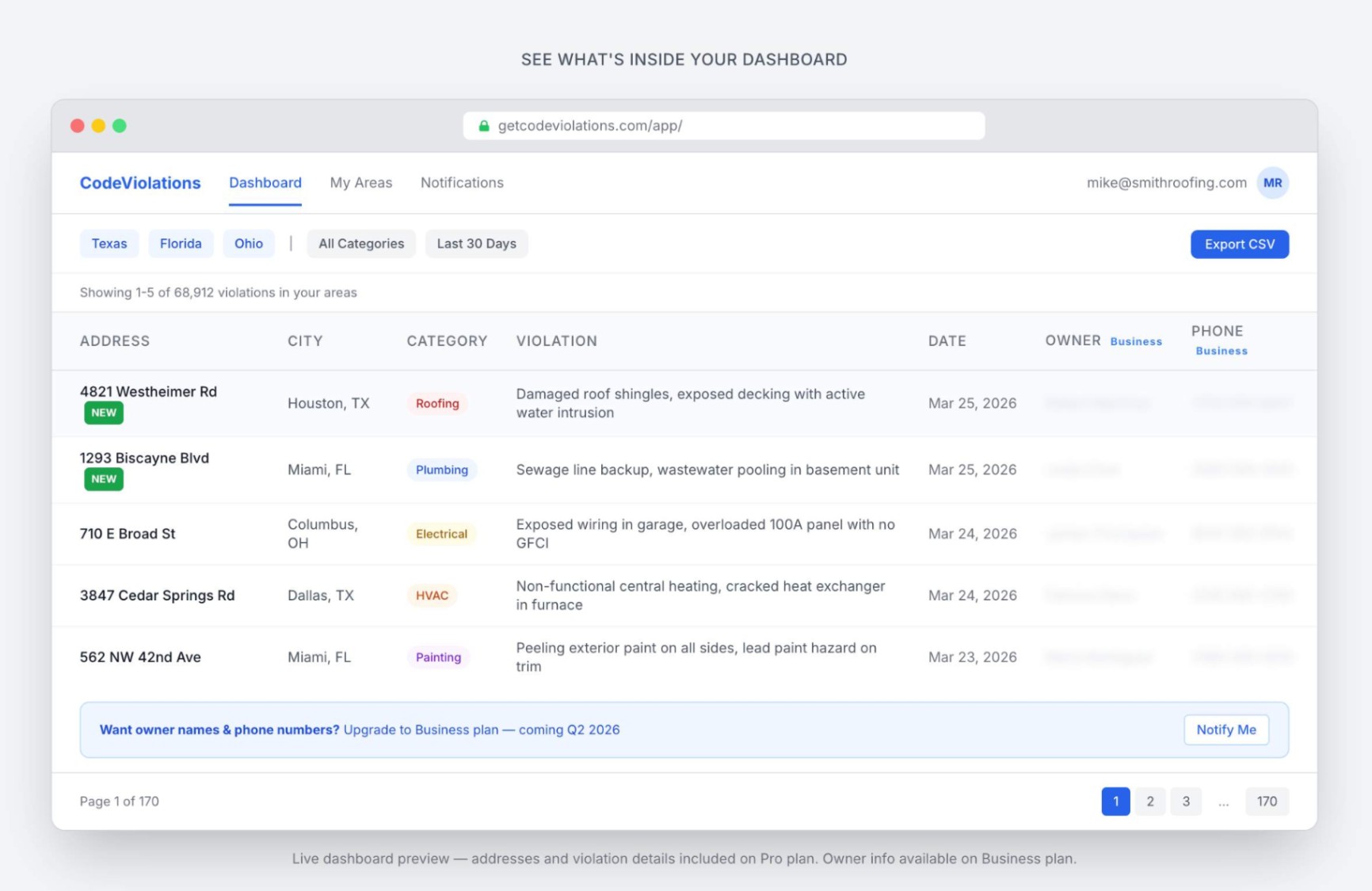 CodeViolations delivers fresh property addresses with open building code violations to roofers, plumbers, electricians, and contractors across 28+ US
