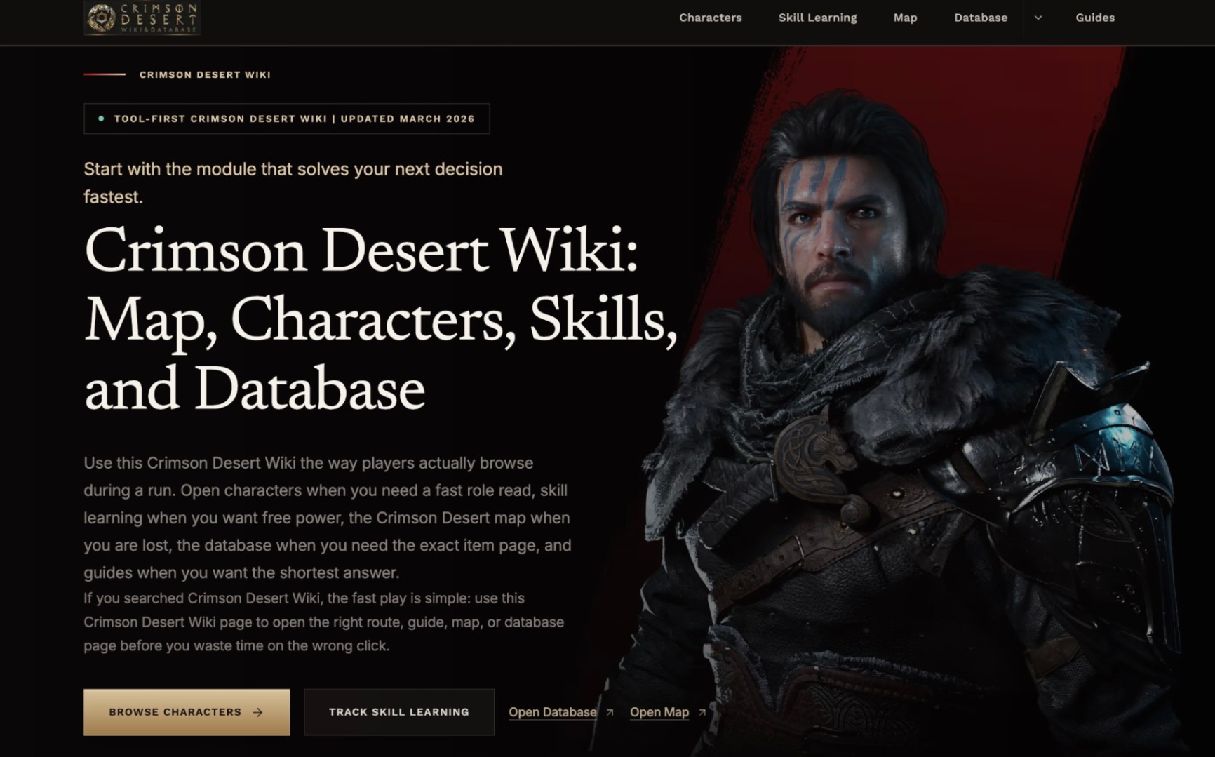 A tool-first Crimson Desert wiki built to help players compare characters, track skill learning, use the map, search the database, and solve the next blocker fast.