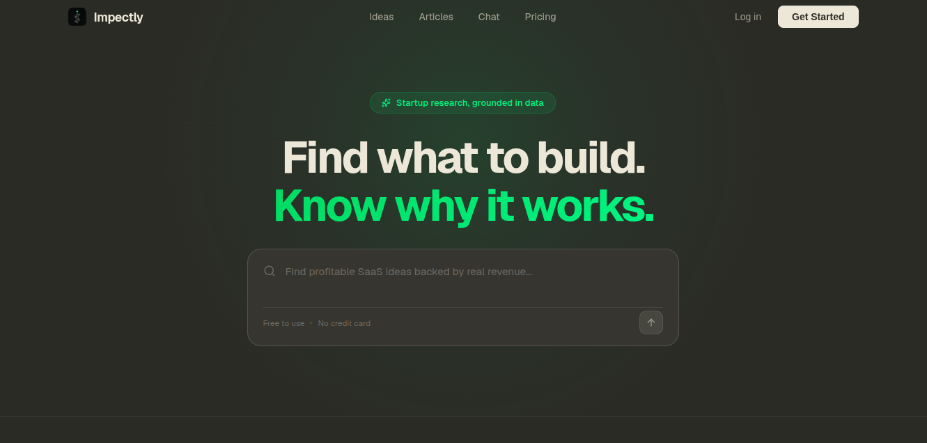 Impectly is an AI startup research tool that lets you search a database of verified startups using natural language. Get real MRR history, SEO metrics, traffic data, and competitive analysis — not blog-post guesses. Ask a question, get data-backed answers. Free to use, no credit card needed.