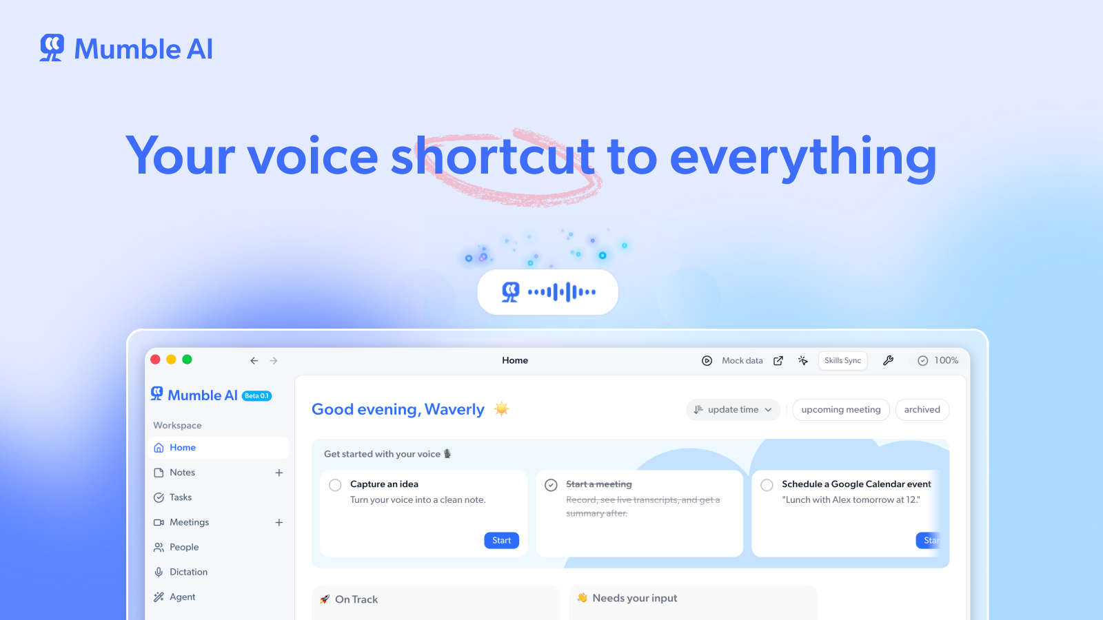 Mumble AI is a voice-first productivity app for Mac that combines meeting recording, dictation, and voice notes in one place. Record meetings without a bot joining call, dictate into any app with a keypress, and capture voice notes that auto-organize themselves. A built-in agent with skills lets you take actions like scheduling, research, and content creation by voice. Runs on both local and cloud AI, so you can choose between on-device privacy and cloud accuracy across 40+ languages. Free plan available.