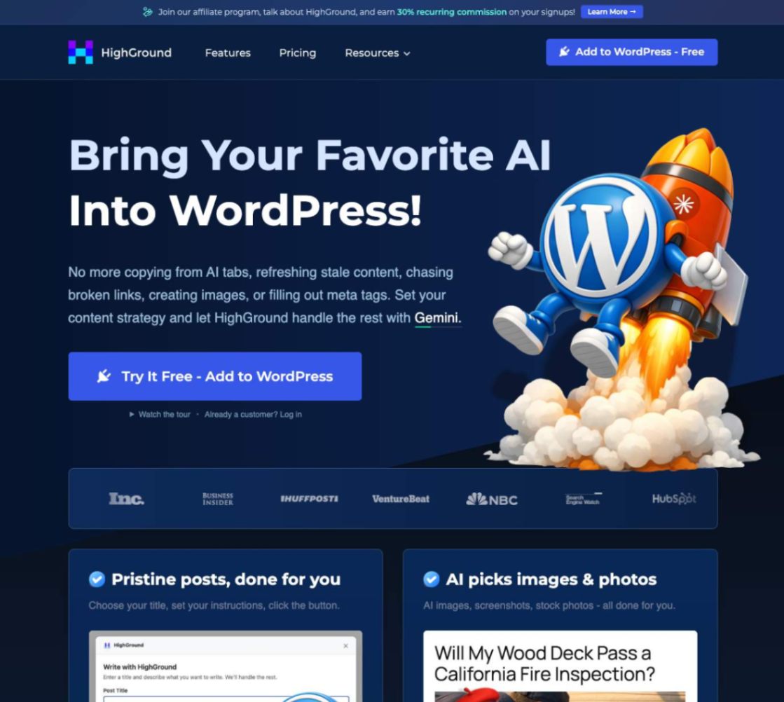 HighGround is the AI content operating system for WordPress. Writing, images, SEO, internal links, and schema - handled by Claude, ChatGPT, or Gemini.