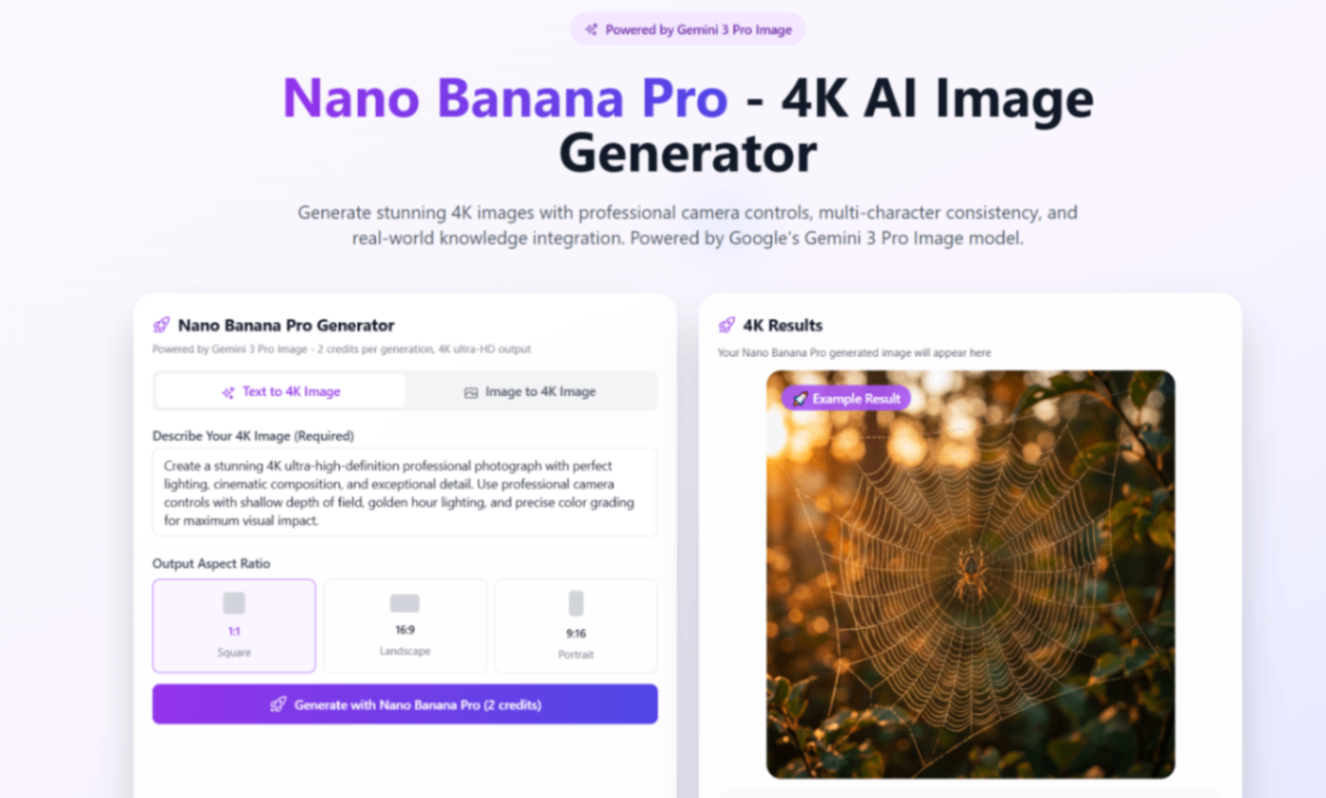 Nano Banana AI Pro (also known as Nano Banana Pro) powered by Gemini 3 Pro! 4K resolution, character consistency, natural language editing.