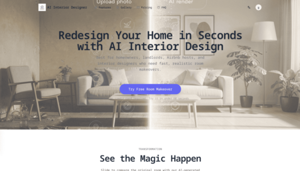AIInteriorDesigner.org is an AI room makeover tool that lets you upload a photo of your space, pick (or describe) a style, and generate realistic, high-resolution redesign renders in seconds.