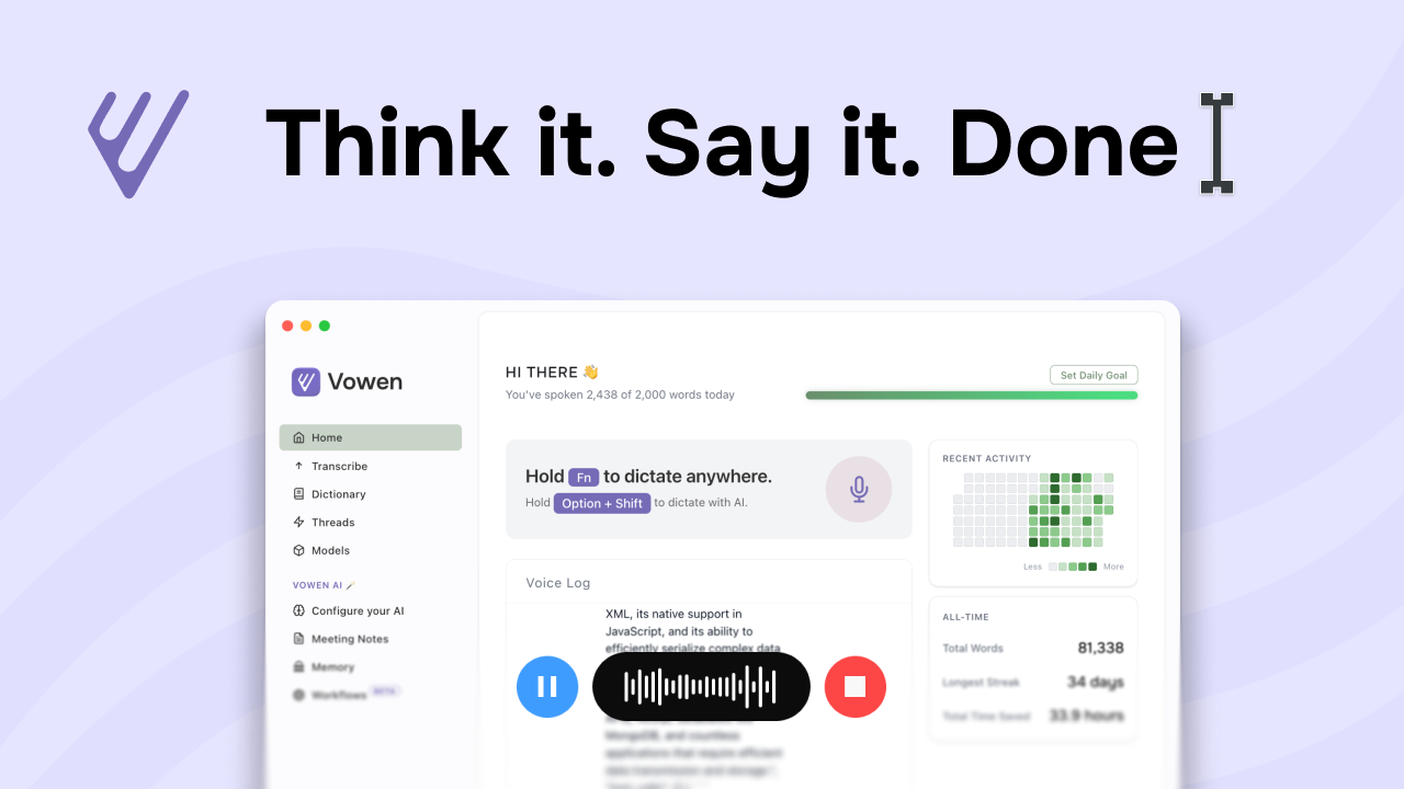 Vowen is a private, offline, voice-first productivity app for dictation, AI workflows, meeting notes, and voice control on macOS and Windows.