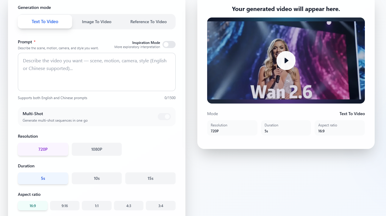 Browser-based AI video creation with text-to-video, reference video guidance, and multi-shot story flows—powered by Wan 2.6