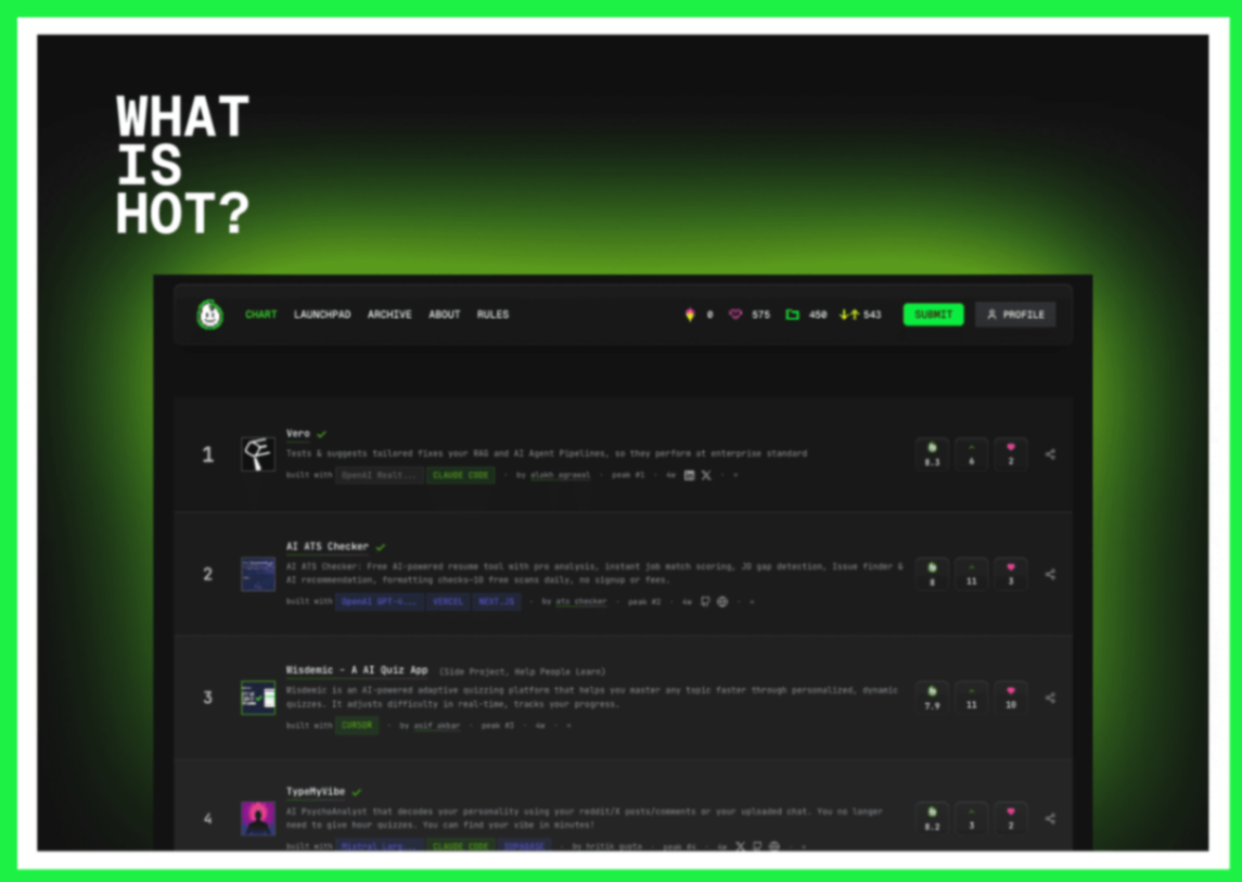 Hot100.ai is a weekly chart that ranks AI products based on innovation, usefulness, and visual design—powered by an in-house AI evaluator